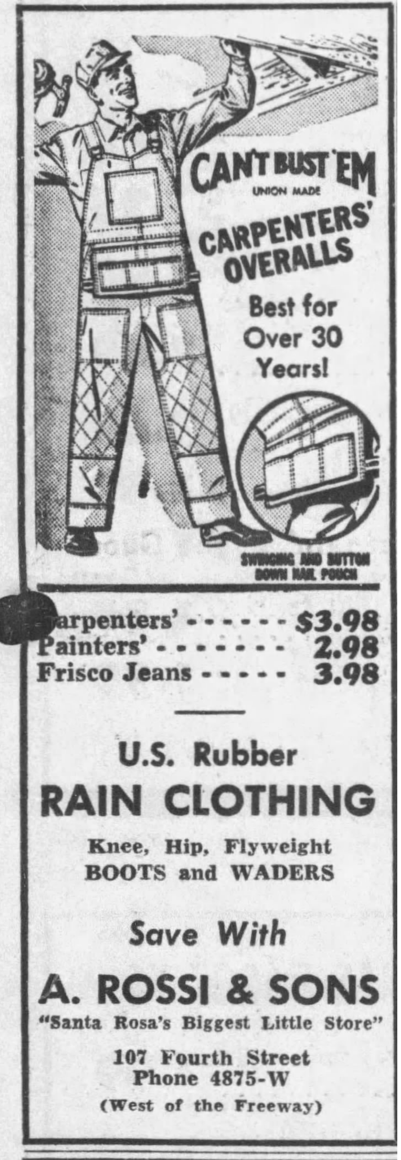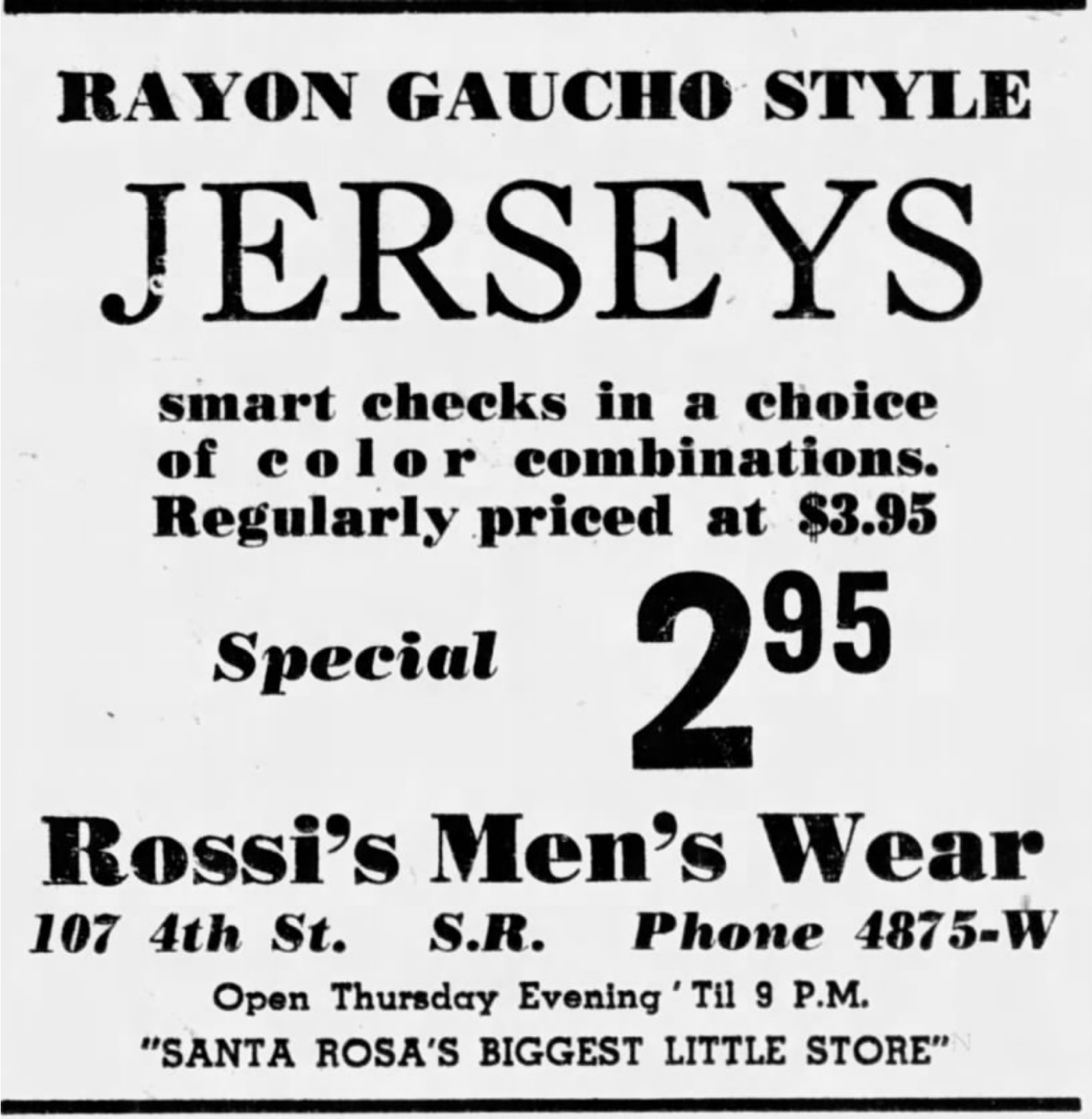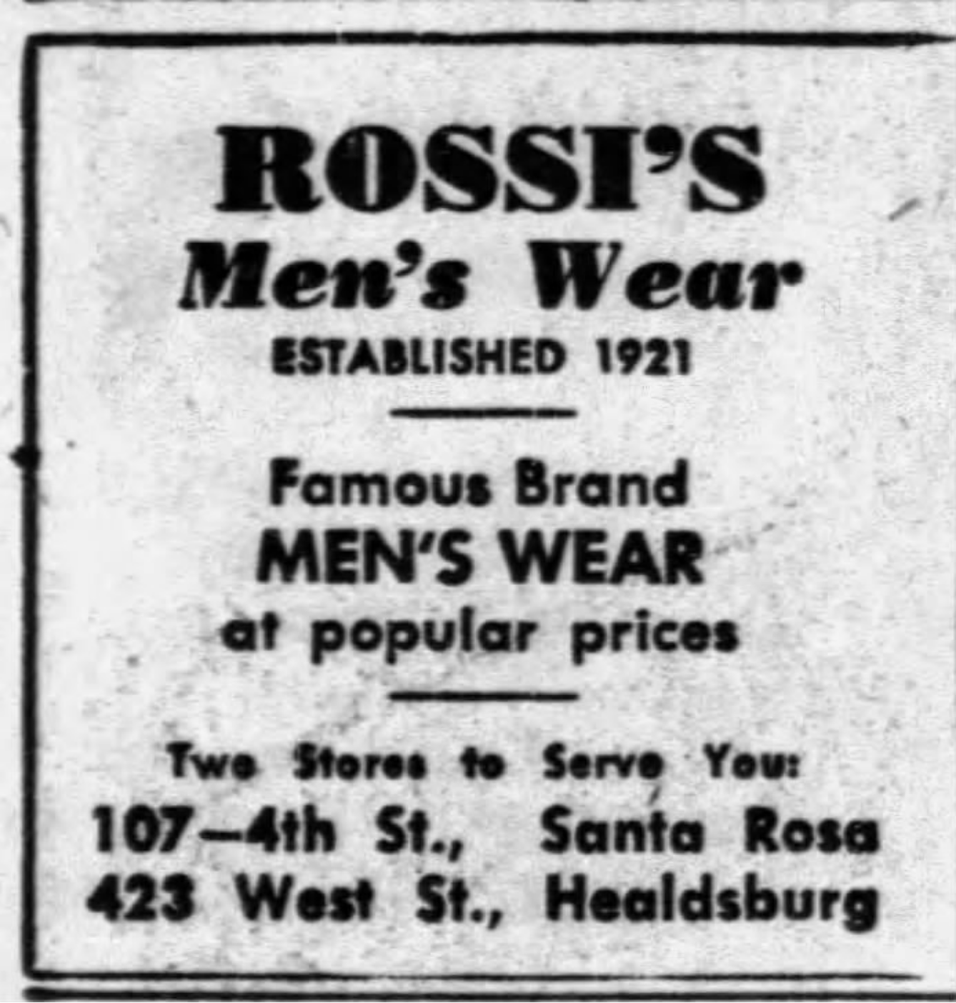 Born Anselmo Rossi in 1884 in the big little town of Licciana Nardi, in the northern Tuscany region of Italy. The history of this town stands the tests of time and carried with Anselmo as he boarded a ship to America in 1904 to create his own family legacy. Arriving in Santa Rosa CA in 1906, he worked as a shoe cobbler and sharpened his skills in clothing, fashion and business. In 1921 he opened the first official family store: A. Rossi & Son. After having 2 more sons, the name became A.Rossi & Sons and the business expanded to 5 locations. 26 years later, the Rossi's were known across Northern California for providing high quality, affordable men's fashion and work wear. Rooted in passion for clothing, family and community, the Rossi name served the North Bay until 1965.
